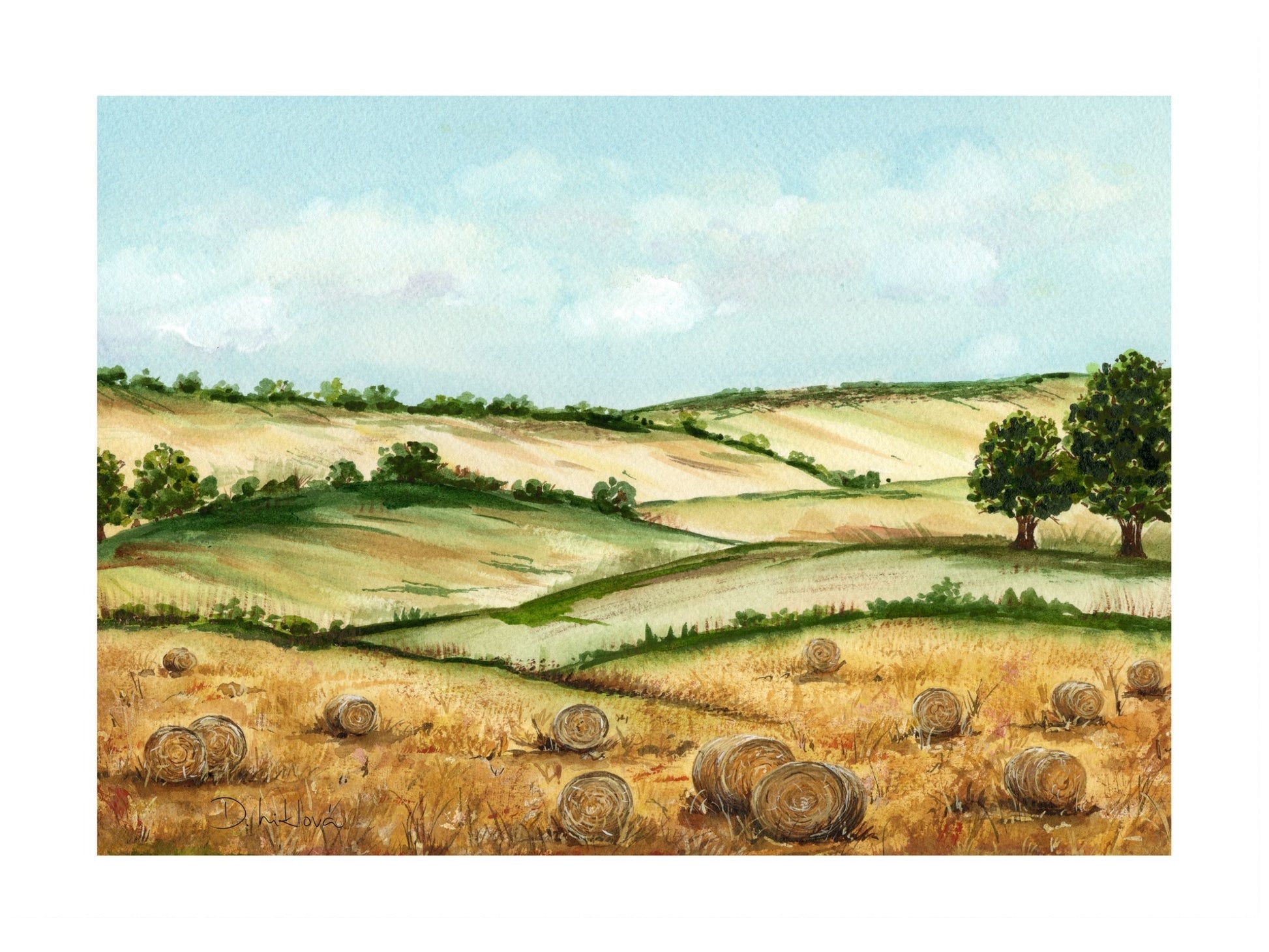 Zlaté pole pod modrým nebem – jemný fine art tisk z autorské akvarelové malby. Sluncem zalité lány, vůně léta a teplý vánek nad balíky slámy vytvářejí obraz klidu, svobody a širokého obzoru. Ideální pro milovníky české krajiny, venkova a letních dnů, kdy se čas zpomalí a svět je prostě dobrý.